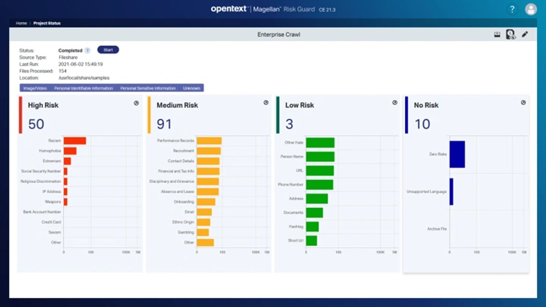 Employing Natural Language Processing, Natural Language Understanding, and Computer Vision it can identify over 50 types of risk, Personally Identifiable Information, and Sensitive Personally Identifiable Information. The configurable risk assessment algorithm lets you adjust the threat level to your organization's tolerance at the level of the scan location. Finding PII in an unsecure file share is high risk compared to finding it in a secure content repository.